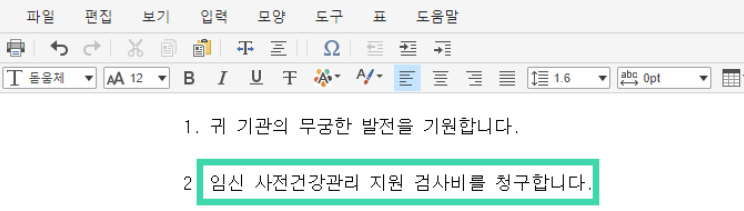 4. 검사비 청구 | 1) 기간: 검사일로부터 3개월 이내 2) 청구 방법: 보건소 방문 또는 e보건소 온라인 청구 https://www.e-health.go.kr/gh/caSrvcGud/selectMdclSupGudInfo.do?heBiz=PG00003&menuId=200097 - 위 링크를 누르고 이동하여 청구 방법에 적힌 대로 따라하시면 됩니다. (1) 필수 제출서류 준비 - 청구서(홈페이지 탑재) - 진료비 영수증 및 세부내역서 각 1부(진료 받은 의료기관에서 바로 발급해 줌) - 입금 계좌 통장사본 1부(개인 명의의 통장사본 1부를 카메라, 스캔 어플 등을 통해 첨부) (2) 문서24 회원가입 및 로그인(https://docu.gdoc.go.kr) 모바일 접속 시 개인 회원 가입 불가 (3) 공문 접수 - 접속: 메인 → 문서 보내기 → STEP 01 문서 제출 전 확인사항 → STEP 02 문서작성 - 받는 기관: 주민등록상 주소지 관할 보건소로 설정 ex) OO구 보건소 - 문서제목: "임신 사전건강관리 지원 검사비 청구" (문서번호는 자동 설정됨) - 문서내용: 자동 작성된 서식에 "임신 사전건강관리 지원 검사비를 청구합니다." 문구 작성 ![]() - 제출자명: 청구자 성명(발신자명과 동일하여야 함) (직인날인 불필요) - 붙임파일: 청구서, 진료비 영수증, 세부내역서, 입금 계좌 통장사본 첨부(jpg, pdf 형식) - 전송요청 (4) 접수 여부 확인: 보낸 문서함에서 확인 |